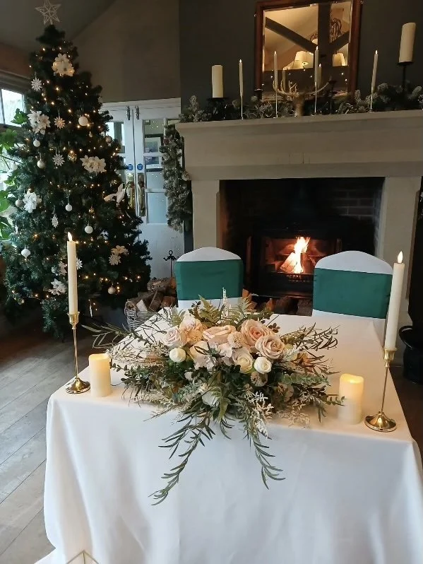 Opting for beautiful neural shades for their décor; greens, creams and golds with just a hint of blush pink, Jo at Vintage Winter Weddings created stunning table centres and décor, which was added to with our stunning fire being lit during the ceremony.